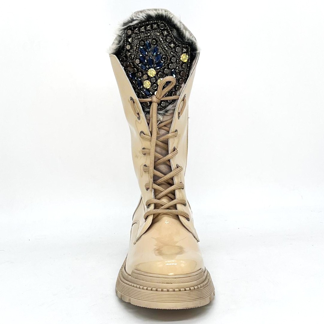 Patent leather combat boots featuring leather lining, cushioned insole, and 5.5 cm rugged sole—handcrafted for bold style and all-day comfort.
