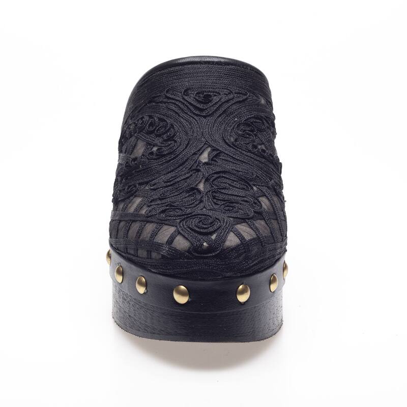 Discover the timeless elegance of the black clogs. These handmade clogs feature intricate embroidery in black thread, perfectly complementing their sleek design. The wooden platform, measuring 6 cm in height, adds durability and natural charm. Enhanced with leather and metal details, the clogs boast a luxurious leather lining and insole for all-day comfort. Ideal for adding sophistication to your casual or semi-formal wardrobe, these clogs are a perfect blend of tradition and modernity.