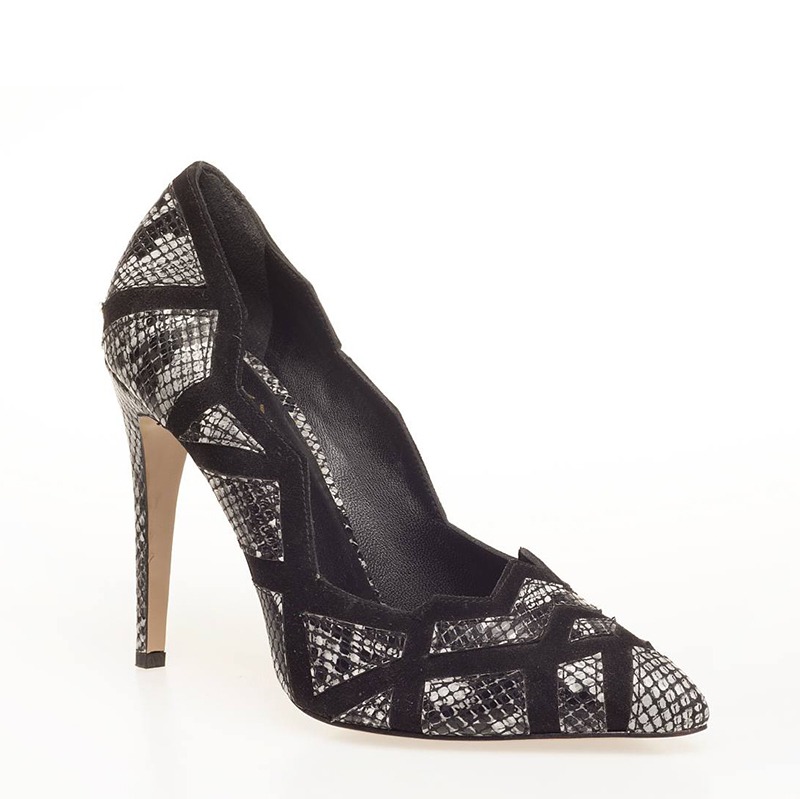 Artisan handmade snake patchwork heel in black suede and snake leather, featuring a 10.5 cm slim heel, anatomical cushioning, and handcrafted detailing for a standout look.