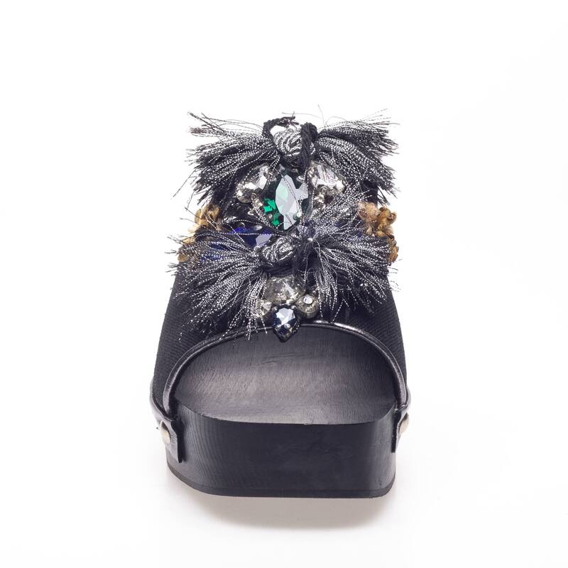 The black clogs sandals is a handcrafted design made with black linen fabric. Decorated with stones and featuring a 5.5 cm wooden platform, leather lining, and insole, this sandal blends elegance and comfort seamlessly.